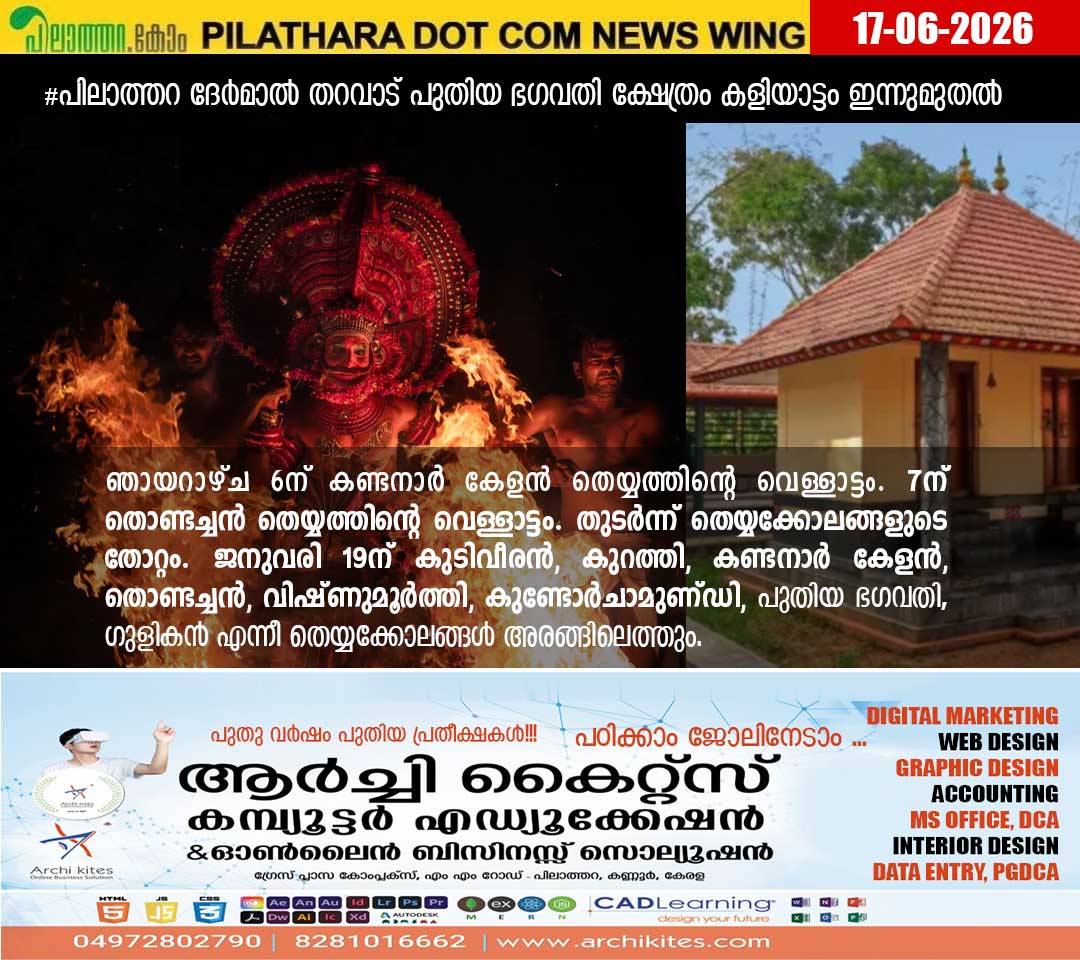 പിലാത്തറ ദേർമാൽ തറവാട് പുതിയ ഭഗവതി ക്ഷേത്രം കളിയാട്ടം ഇന്നു തുടങ്ങും. 19ന് സമാപിക്കും. ഇന്ന് 7ന് കുന്നുമ്പ്രം ദേശീയ കലാസമിതി അവതരിപ്പിക്കുന്ന പാലന്തായി കണ്ണൻ വിൽക്കലാമേള.
