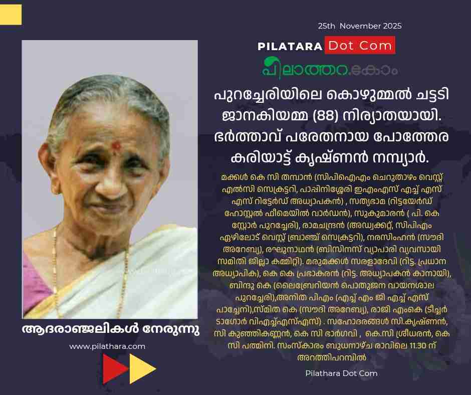പുറച്ചേരിയിലെ കൊഴുമ്മൽ ചട്ടടി ജാനകിയമ്മ (88) നിര്യാതയായി. ഭർത്താവ് പരേതനായ പോത്തേര കരിയാട്ട് കൃഷ്ണൻ നമ്പ്യാർ.