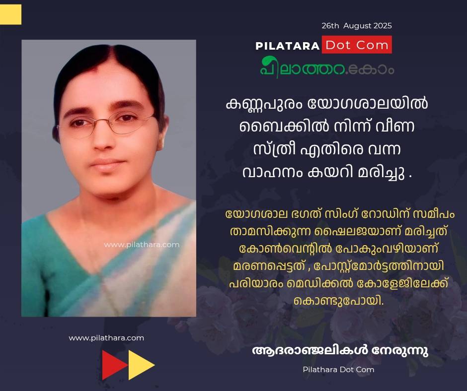 കണ്ണപുരം യോഗശാലയിൽ ബൈക്കിൽ നിന്ന് വീണ സ്ത്രീ എതിരെ വന്ന വാഹനം കയറി മരിച്ചു