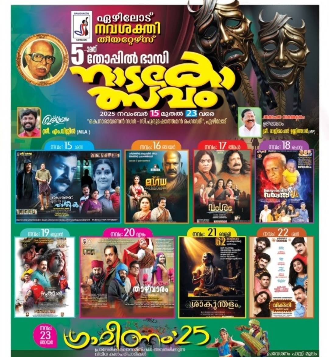 ഏഴിലോട് നവശക്തിയുടെ അഭിമുഖ്യത്തിൽ നടത്തുന്ന അഞ്ചാമത് തോപ്പിൽ ഭാസി നടകോത്സവം നവംബർ 15 മുതൽ 23 വരെ എഴിലോട്കെ. നാരായണൻ നഗറിൽ വെച്ച് നടക്കും.