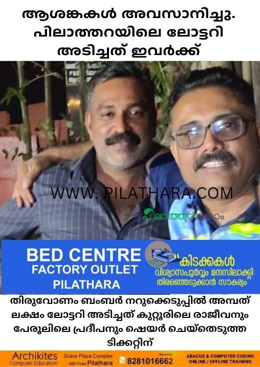 തിരുവോണം ബംബർ നറുക്കെടുപ്പിൽ അമ്പത് ലക്ഷം ലോട്ടറി അടിച്ചത് കുറ്റൂരിലെ രാജീവനും പേരൂലിലെ പ്രദീപനും ഷെയർ ചെയ്തെടുത്ത ടിക്കറ്റിന്