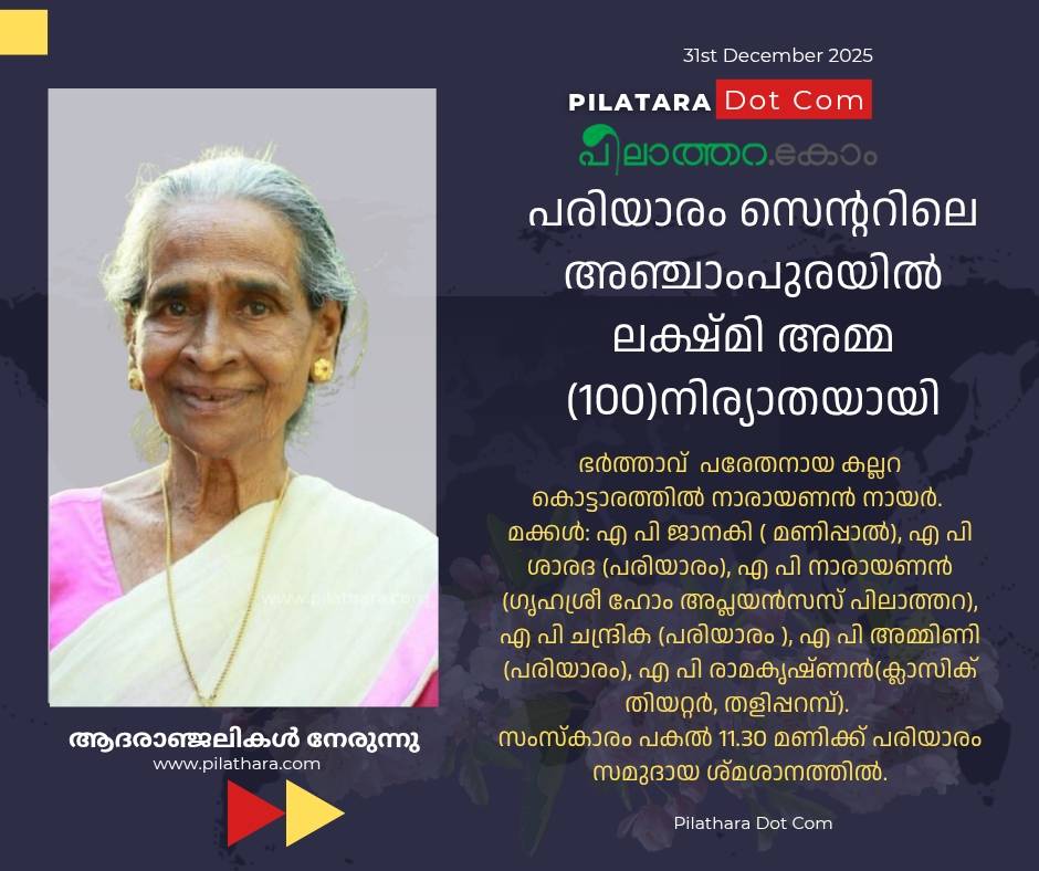 പരിയാരം : പരിയാരം സെൻ്ററിലെ അഞ്ചാംപുരയിൽ ലക്ഷ്മി അമ്മ (100)നിര്യാതയായി.