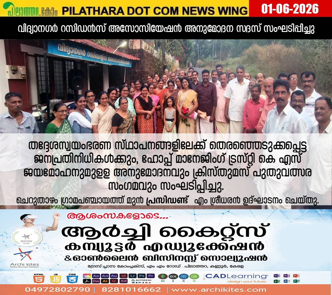 പിലാത്തറ: വിദ്യാനഗർ റസിഡൻസ് അസോസിയേഷൻ്റെ നേതൃത്വത്തിൽ തദ്ദേശസ്വയംഭരണ സ്ഥാപനങ്ങളിലേക്ക് തെരഞ്ഞെടുക്കപ്പെട്ട ജനപ്രതിനിധികൾക്കും, ഹോപ്പ് മാനേജിംഗ് ട്രസ്റ്റി കെ എസ് ജയമോഹനുമുളള അനുമോദനവും ക്രിസ്തുമസ് പുതുവത്സര സംഗമവും സംഘടിപ്പിച്ചു. ചെറുതാഴം ഗ്രാമപഞ്ചായത്ത് മുൻ പ്രസിഡണ്ട് എം ശ്രീധരൻ ഉദ്ഘാടനം ചെയ്തു. അസോസിയേഷൻ പ്രസിഡണ്ട് എ ബാലകൃഷ്ണൻ്റെ അധ്യക്ഷനായി. ജില്ലാ പഞ്ചായത്ത് അംഗം പി വി ജയശ്രീ ടീച്ചർ, ബ്ലോക്ക് പഞ്ചായത്ത് അംഗം കെ ഭാനുമതി, ചെറുതാഴം ആറാം വാർഡ് അംഗം കെ സൂരജ്, കെ എസ് ജയമോഹൻ എന്നിവരെ കെ ഡി ബെന്നി, പി വി രോഹിണി, എ കെ സഹദേവൻ എന്നിവർ പൊന്നാട അണിയിച്ച് അനുമോദിച്ചു. പി എസ് ബഷീർ നന്ദി പറഞ്ഞു.