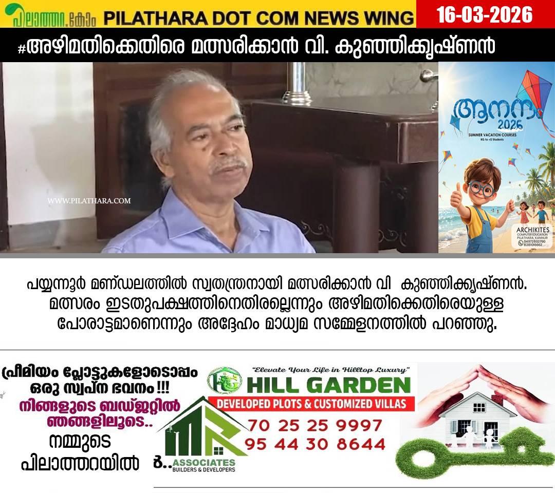 പയ്യന്നൂർ മണ്ഡലത്തിൽ സ്വതന്ത്രനായി മത്സരിക്കാൻ വി കുഞ്ഞിക്കൃഷ്ണൻ. മത്സരം ഇടതുപക്ഷത്തിനെതിരല്ലെന്നും അഴിമതിക്കെതിരെയുള്ള പോരാട്ടമാണെന്നും അദ്ദേഹം മാധ്യമ സമ്മേളനത്തിൽ പറഞ്ഞു.