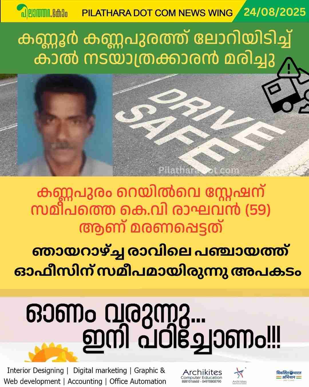 ദേശീയപാതയിൽ പയ്യന്നൂർ എടാട്ട് സെൻട്രൽ സ്കൂൾ റോഡിന് സമീപം കാൽനടയാത്രികൻ വാഹനമിടിച്ച് മരിച്ചു.