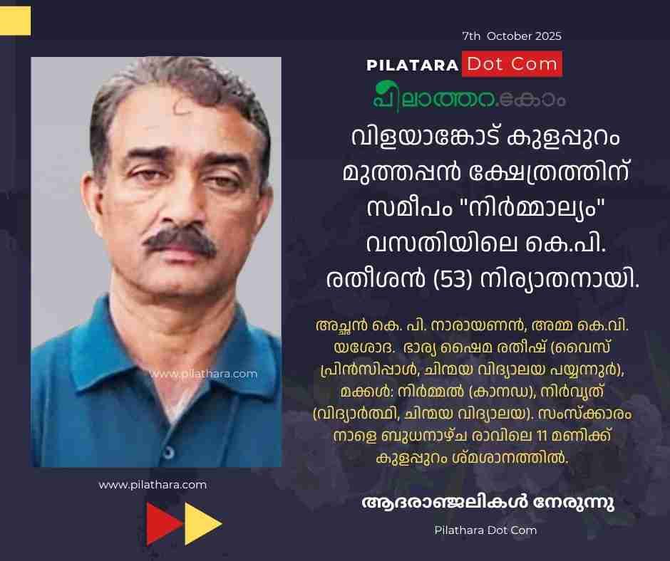 വിളയാങ്കോട് കുളപ്പുറം മുത്തപ്പൻ ക്ഷേത്രത്തിന് സമീപം "നിർമ്മാല്യം" വസതിയിലെ കെ.പി. രതീശൻ (53) നിര്യാതനായി.