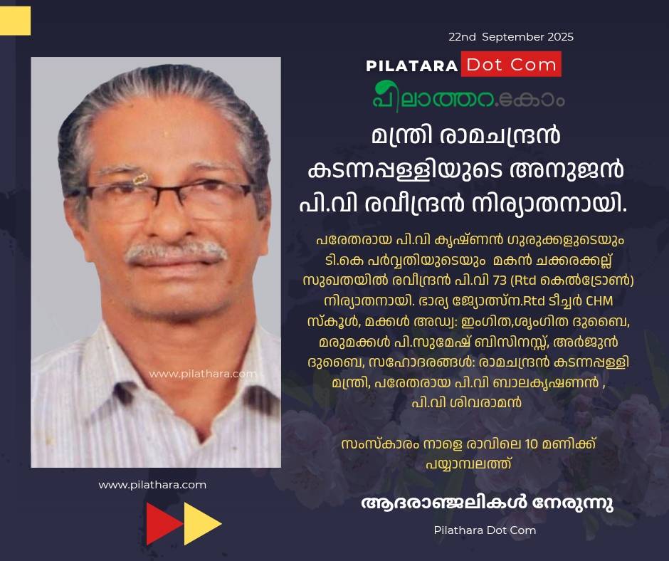 പരേതരായ പി.വി കൃഷ്ണൻ ഗുരുക്കളുടെയും ടി.കെ പർവ്വതിയുടെയും മകൻ ചക്കരക്കല്ല് സുഖതയിൽ രവീന്ദ്രൻ പി.വി 73 (Rtd കെൽട്രോൺ) നിര്യാതനായി. ഭാര്യ ജ്യോത്സ്ന.Rtd ടീച്ചർ CHM സ്കൂൾ, മക്കൾ അഡ്വ: ഇംഗിത,ശൃംഗിത ദുബൈ, മരുമക്കൾ പി.സുമേഷ് ബിസിനസ്സ്, അർജുൻ ദുബൈ, സഹോദരങ്ങൾ: രാമചന്ദ്രൻ കടന്നപ്പള്ളി മന്ത്രി, പരേതരായ പി.വി ബാലകൃഷണൻ , പി.വി ശിവരാമൻ സംസ്കാരം നാളെ രാവിലെ 10 മണിക്ക് പയ്യാമ്പലത്ത്