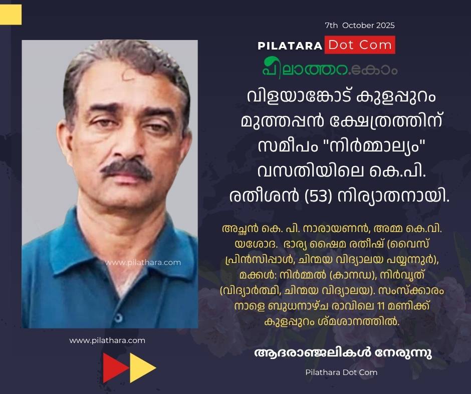 വിളയാങ്കോട് കുളപ്പുറം മുത്തപ്പൻ ക്ഷേത്രത്തിന് സമീപം "നിർമ്മാല്യം" വസതിയിലെ കെ.പി. രതീശൻ (53) നിര്യാതനായി.