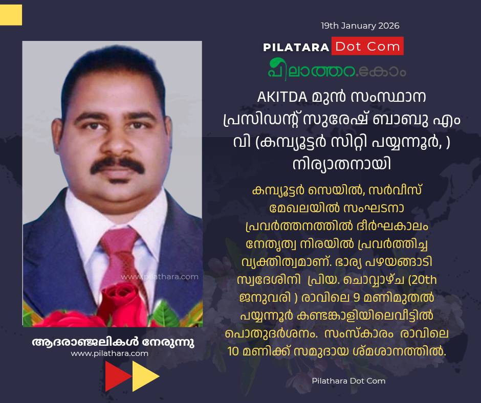 AKITDA മുൻ സംസ്ഥാന പ്രസിഡന്റ് സുരേഷ് ബാബു എം വി (കമ്പ്യൂട്ടർ സിറ്റി പയ്യന്നൂർ, ) നിര്യാതനായി.