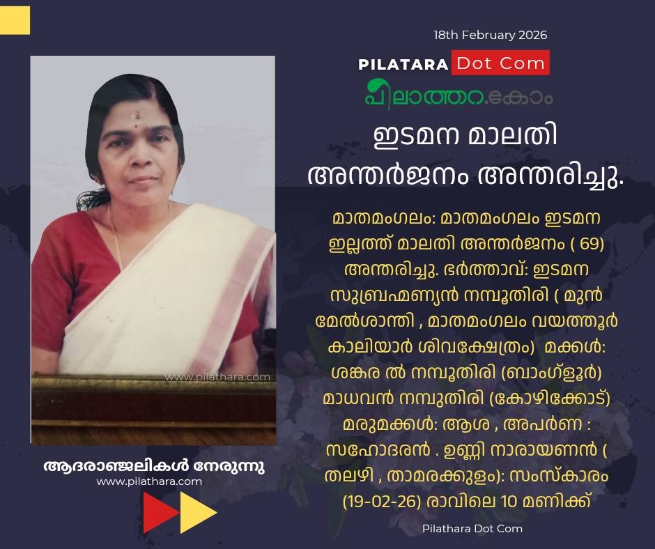 മാതമംഗലം ഇടമന ഇല്ലത്ത് മാലതി അന്തർജനം ( 69) അന്തരിച്ചു. ഭർത്താവ്: ഇടമന സുബ്രഹ്മണ്യൻ നമ്പൂതിരി ( മുൻ മേൽശാന്തി , മാതമംഗലം വയത്തൂർ കാലിയാർ ശിവക്ഷേത്രം) മക്കൾ: ശങ്കര ൽ നമ്പൂതിരി (ബാംഗ്ളൂർ) മാധവൻ നമ്പുതിരി (കോഴിക്കോട്) മരുമക്കൾ: ആശ , അപർണ : സഹോദരൻ . ഉണ്ണി നാരായണൻ ( തലഴി , താമരക്കുളം): സംസ്കാരം ഇന്ന് (19-2) രാവിലെ 10 മണിക്ക്