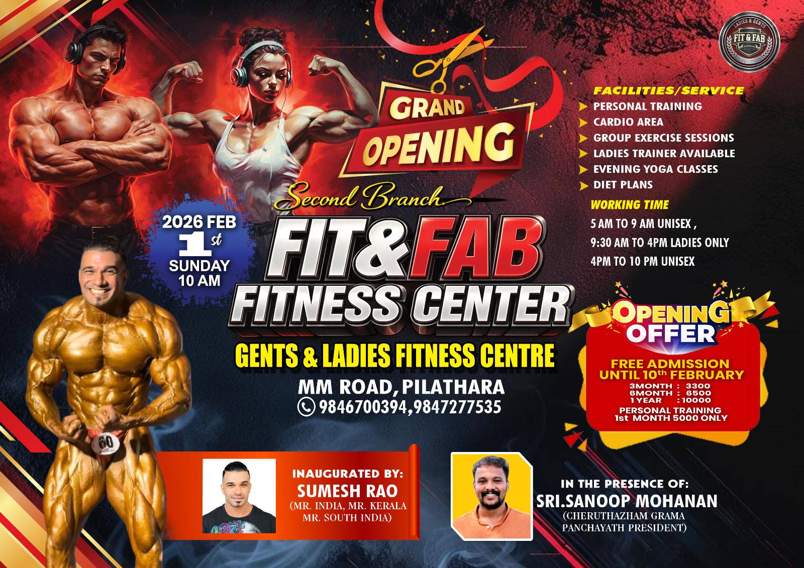 ഫിറ്റ് & ഫാബ് ഫിറ്റ്നസ് ലേഡീസ് ആൻഡ് ജെൻസ് ഫിറ്റ്നസ് സെൻറർ – ഗ്രാൻഡ് ഓപ്പണിംഗ് ഞായറാഴ്ച ഫെബ്രുവരി ഒന്നിന് രാവിലെ 10 മണിക്ക് അത്യാധുനിക സൗകര്യങ്ങളോടുകൂടി പിലാത്തറ മാതമംഗലം റോഡിൽ തുറന്ന് പ്രവർത്തനം ആരംഭിക്കുന്നു.