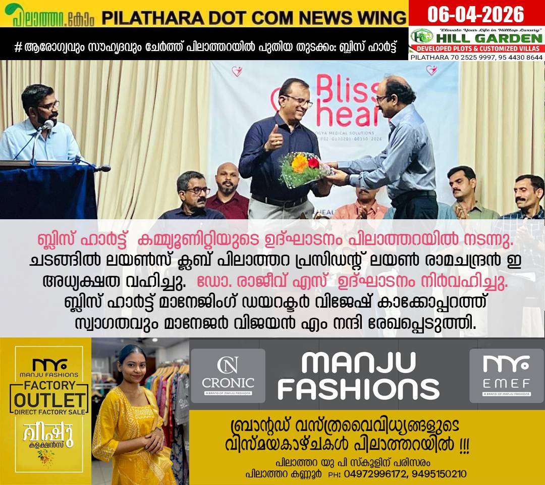 ബ്ലിസ് ഹാർട്ട് കമ്മ്യൂണിറ്റിയുടെ ഉദ്ഘാടനം പിലാത്തറയിൽ നടന്നു. ചടങ്ങിൽ ലയൺസ് ക്ലബ് പിലാത്തറ പ്രസിഡന്റ് ലയൺ രാമചന്ദ്രൻ ഇ അധ്യക്ഷത വഹിച്ചു. ഡോ. രാജീവ് എസ് ഉദ്ഘാടനം നിർവഹിച്ചു. ബ്ലിസ് ഹാർട്ട് മാനേജിംഗ് ഡയറക്ടർ വിജേഷ് കാക്കോപ്പറത്ത് സ്വാഗതവും മാനേജർ വിജയൻ എം നന്ദി രേഖപ്പെടുത്തി.