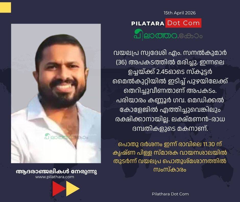 വയലപ്ര സ്വദേശി എം. സനല്കുമാര് (36) അപകടത്തില് മരിച്ചു. ഇന്നലെ ഉച്ചകഴിഞ്ഞ് 2.45ഓടെ വയലപ്ര വച്ച് സ്കൂട്ടര് മൈല്കുറ്റിയില് ഇടിച്ച് പുഴയിലേക്ക് തെറിച്ചുവീണതാണ് അപകടം. പരിയാരം കണ്ണൂര് ഗവ. മെഡിക്കല് കോളേജില് എത്തിച്ചുവെങ്കിലും രക്ഷിക്കാനായില്ല. ലക്ഷ്മണന്-രാധ ദമ്പതികളുടെ മകനാണ്.