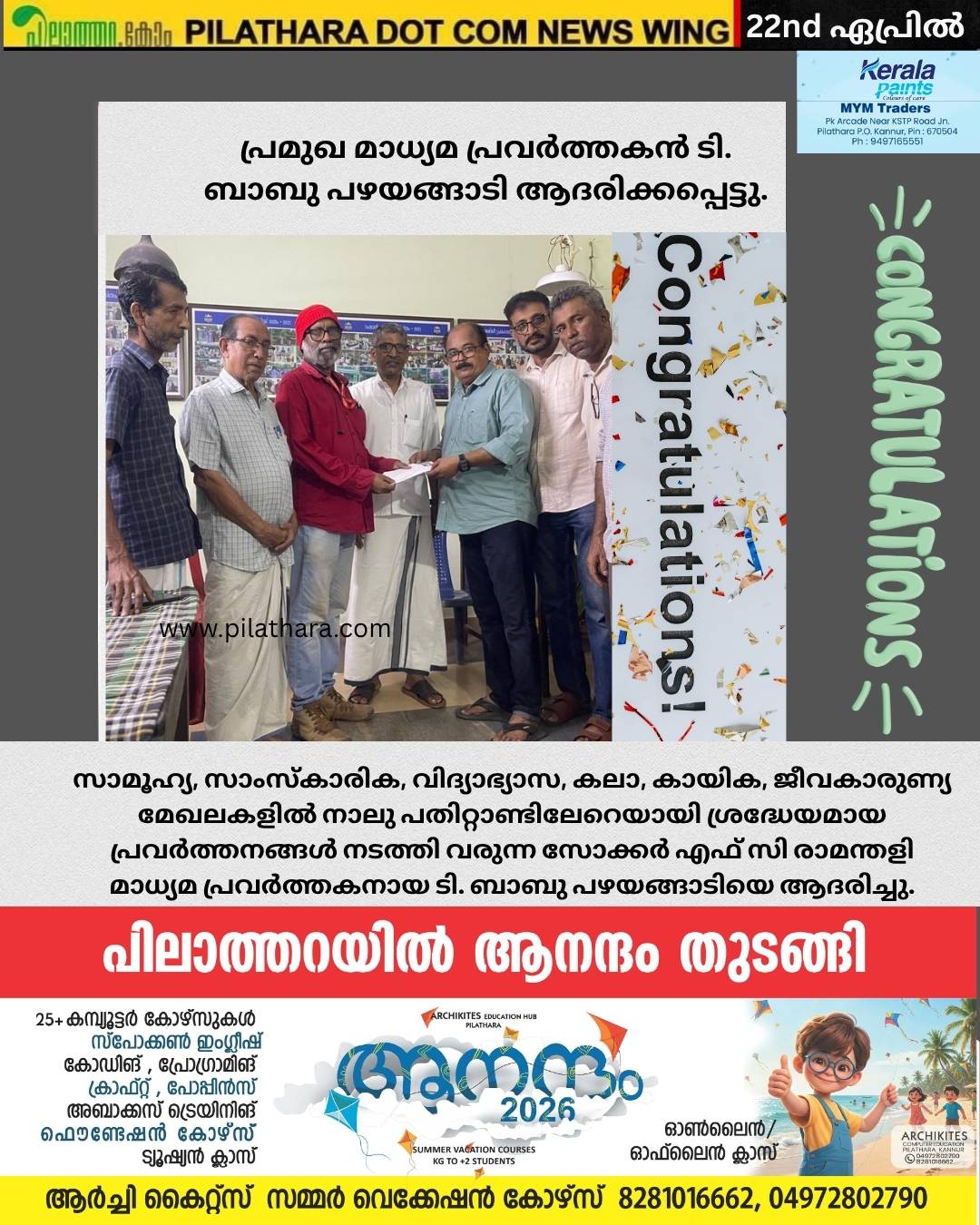 രാമന്തളി: സാമൂഹ്യ, സാംസ്കാരിക, വിദ്യാഭ്യാസ, കലാ, കായിക, ജീവകാരുണ്യ മേഖലകളിൽ നാലു പതിറ്റാണ്ടിലേറെയായി ശ്രദ്ധേയമായ പ്രവർത്തനങ്ങൾ നടത്തി വരുന്ന സോക്കർ എഫ് സി രാമന്തളി മാധ്യമ പ്രവർത്തകനായ ടി. ബാബു പഴയങ്ങാടിയെ ആദരിച്ചു.