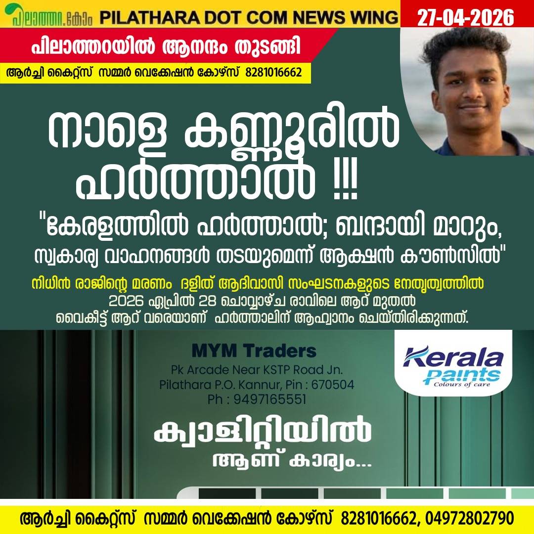 കണ്ണൂര്: അഞ്ചരക്കണ്ടി ദന്തൽ കോളജ് വിദ്യാര്ഥി നിതിന് രാജിൻ്റെ മരണത്തില് കുറ്റക്കാര്ക്കെതിരെ നടപടി ആവശ്യപ്പെട്ട് സംസ്ഥാനത്ത് നാളെ (ഏപ്രിൽ 28, ചൊവ്വാഴ്ച) ഹർത്താൽ. ജസ്റ്റിസ് ഫോര് നിതിന് രാജ് ആക്ഷന് കൗണ്സിലും ദളിത് ആദിവാസി സംഘടനകളുമാണ് ഹർത്താൽ പ്രഖ്യാപിച്ചിരിക്കുന്നത്. ഹർത്താൽ ബന്ദായി മാറുമെന്നും എല്ലാവരും സഹകരിക്കണമെന്നും ആക്ഷന് കൗണ്സില് ഭാരവാഹികൾ പറഞ്ഞു. നിരവധി സംഘടനകൾ ഹർത്താലിന് പിന്തുണ പ്രഖ്യാപിച്ചിട്ടുണ്ട്.