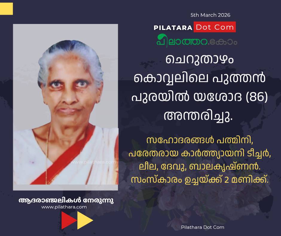 ചെറുതാഴം കൊവ്വലിലെ പുത്തൻ പുരയിൽ യശോദ (86) അന്തരിച്ചു.